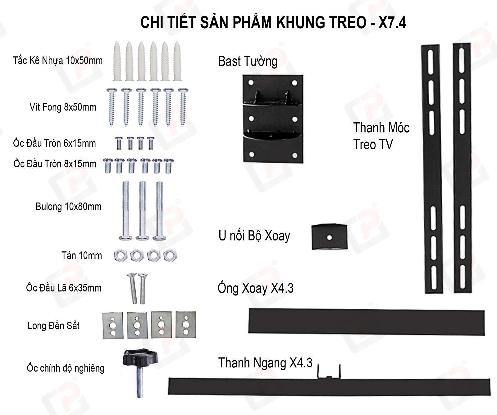 Bộ sản phẩm có kèm theo tắc kê, ốc, vít,… để bạn dễ dàng bắt khung vào tường và bắt tivi vào khung mà không phải tốn thêm bất kỳ khoản chi phí nào.