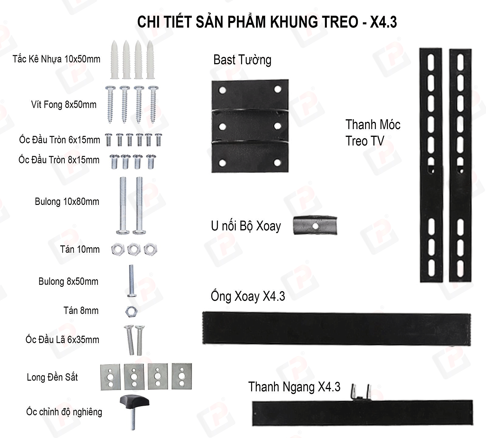 Bộ sản phẩm có kèm theo tắc kê, ốc, vít,… để bạn dễ dàng bắt khung vào tường và bắt tivi vào khung mà không phải tốn thêm bất kỳ khoản chi phí nào.